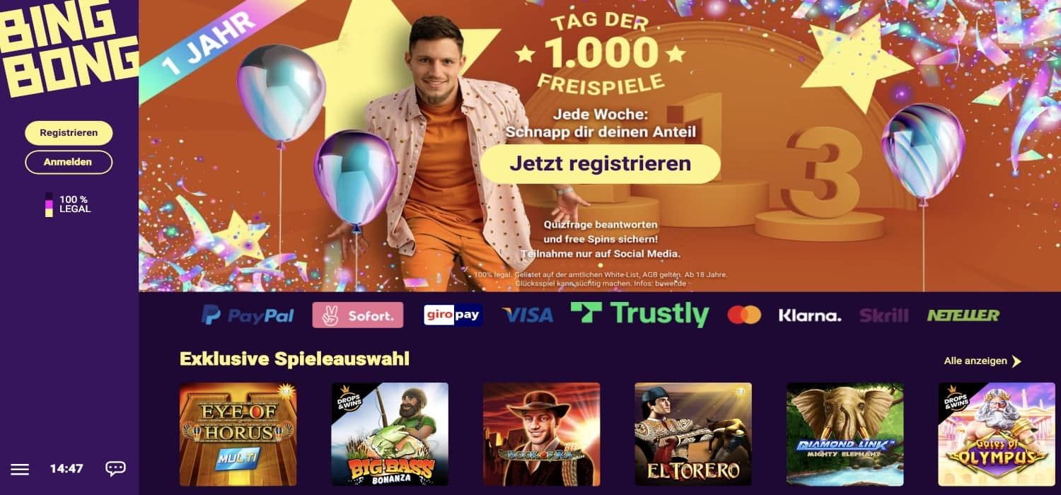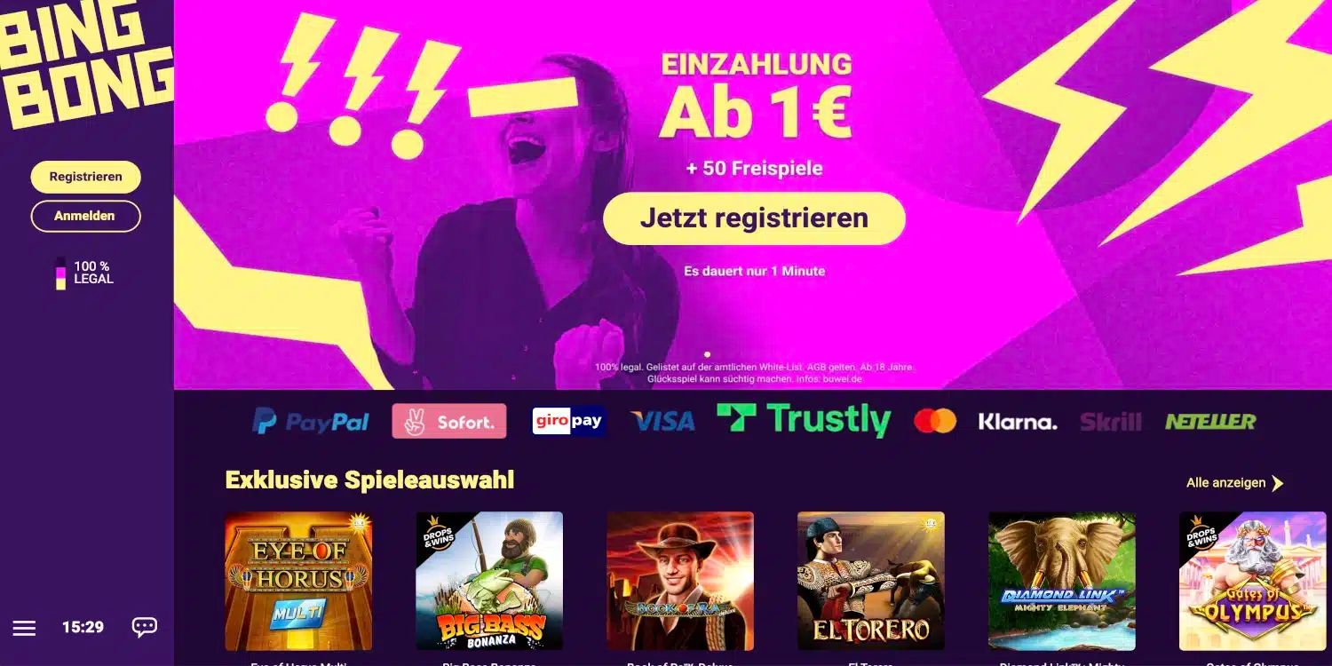 Da BingBong eine deutsche Casino Lizenz hat, ist es völlig legal, hier zu spielen. Wenn wir Sie von diesem Anbieter überzeugen konnten, dann klicken Sie jetzt auf den Link zu BingBong.de, zahlen Sie etwas Geld ein, sichern Sie sich den Bonus und spielen Sie Ihr erstes Spiel.