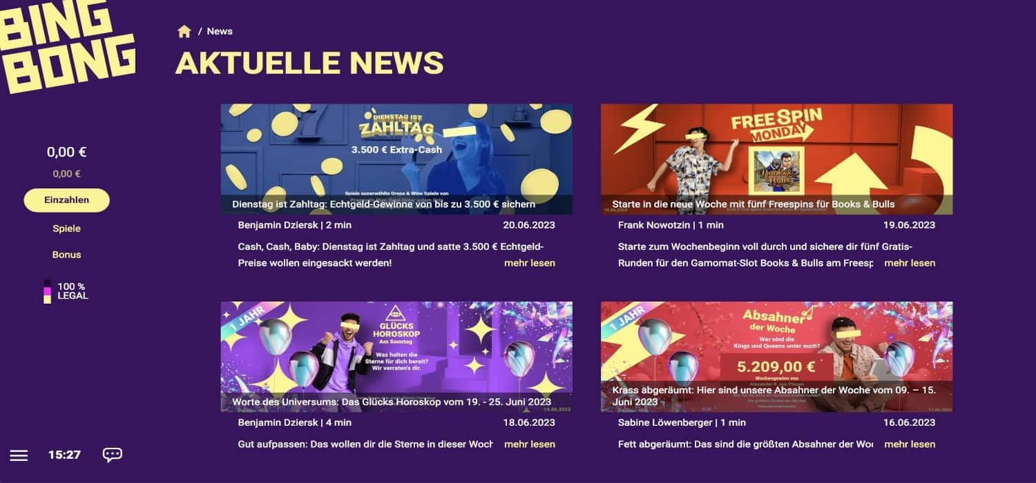 Sobald das erledigt ist, steht Ihnen der volle Funktionsumfang von BingBong.de zur Verfügung. Wenn Sie sich nicht verifizieren lassen, können Sie nur 100 Euro einzahlen und ein Bonus oder eine Auszahlung ist nicht möglich. Deswegen ist es besser, wenn Sie die Verifizierung frühzeitig angehen, damit Ihnen keine Vorteile entgehen.
